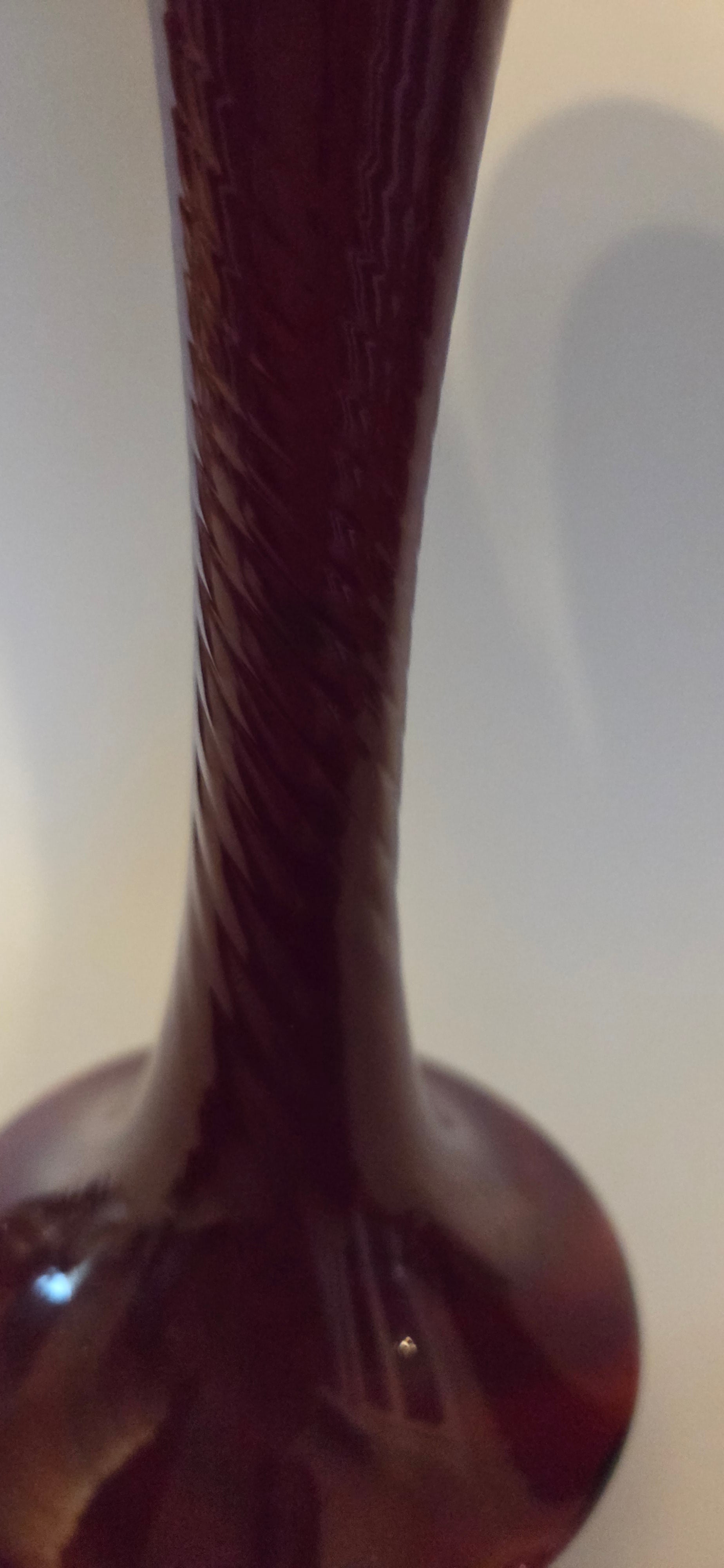This charming Empoli cased glass vase captures the essence of 1960s Italian craftsmanship. Featuring a striking amethyst hue with elegant cased glass construction, it showcases a distinctive twisted stem that adds vintage character. Standing at 23cm tall, this bud vase is perfectly sized for displaying a single stem or small arrangement. An authentic piece of retro glassware that brings nostalgic elegance to any shelf or side table.