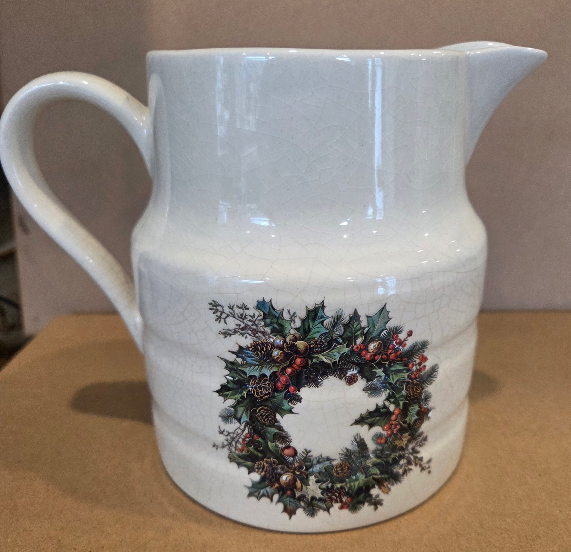 A wonderful vintage find, this 20cm stag jug showcases timeless appeal with its elegant stag motif on one side and festive Christmas wreath on the reverse. The characteristic crazed glaze enhances its authentic aged character. Perfect for displaying seasonal florals or dried flowers, this piece brings warmth and nostalgia to any room. Please note that due to its vintage nature, it may not be completely liquid proof, making it ideal as a decorative vessel rather than for everyday pouring.