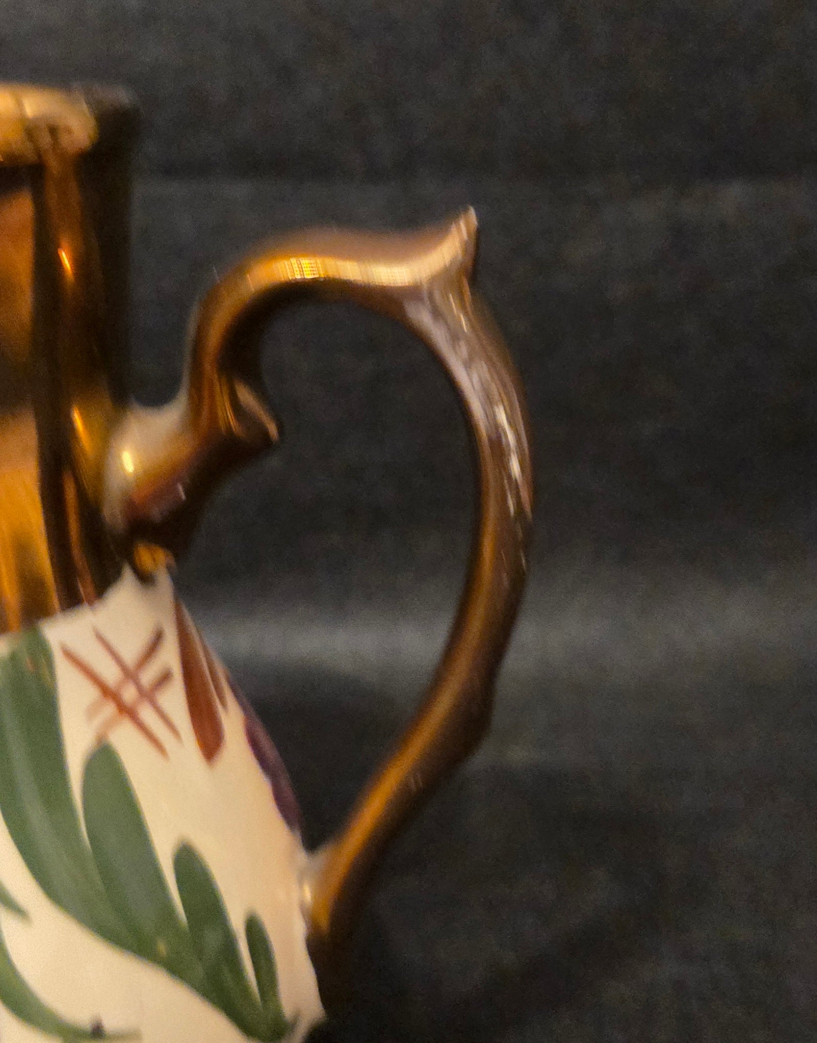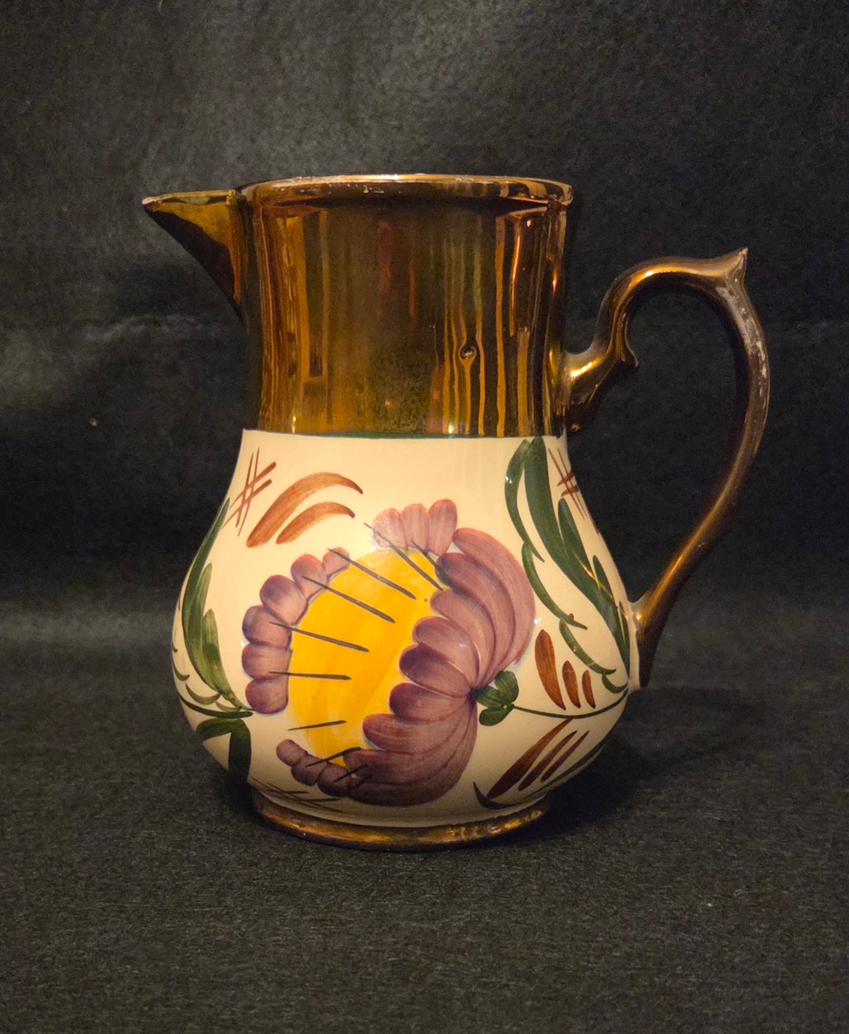 Charming vintage Wade Harvest Ware creamer from the 1950s, featuring delicate hand-painted florals enhanced with copper luster trim. Standing 13cm tall, this piece showcases authentic period character with gentle wear to the luster that adds to its vintage appeal. A lovely addition to any collector's display or functional piece for your kitchen. Please refer to images for detailed condition.
