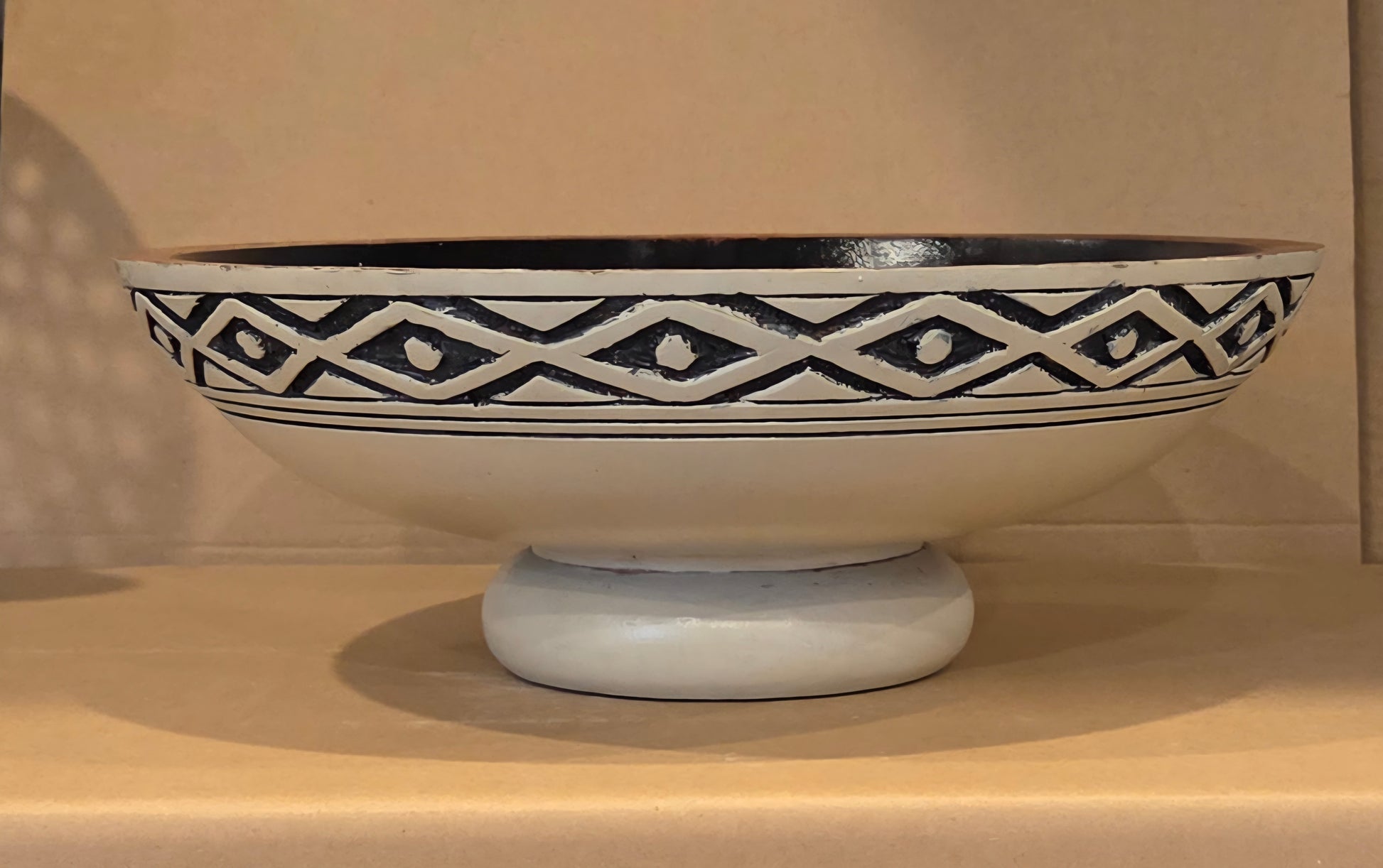 This charming pedestal bowl brings artisanal beauty to any space. Hand-painted with a striking floral design at its centre, it combines functionality with decorative appeal. Measuring 30cm wide and 12cm high, it's perfectly sized for display or practical use. The natural wooden construction offers warmth and character, while the classic pedestal base adds an elegant touch. Simply wipe clean with a damp cloth to maintain its lovely finish. A versatile piece that works beautifully as a fruit bowl, decorative centrepiece, or thoughtful gift for those who appreciate handcrafted home décor.